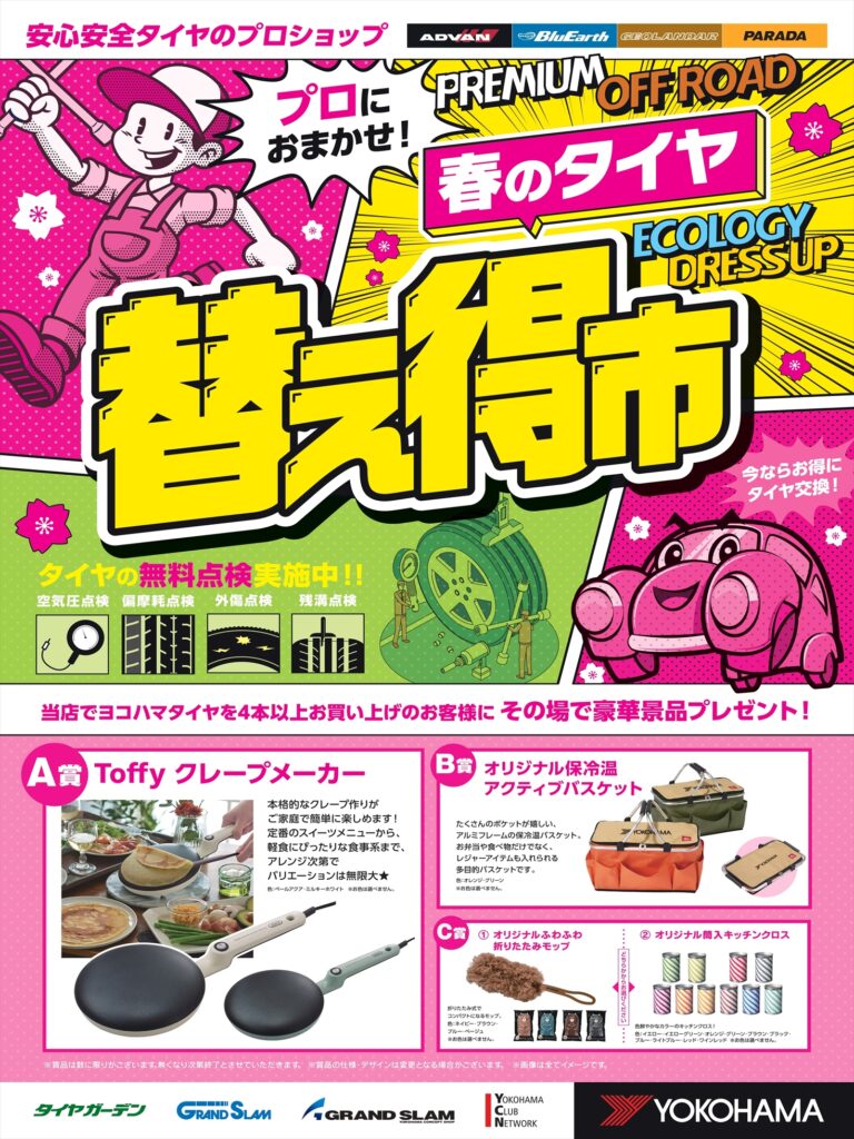 メーカーキャンペーンのプレミアムタイヤキャッシュバックキャンペーンと、春のタイヤ替え得市も同時開催!